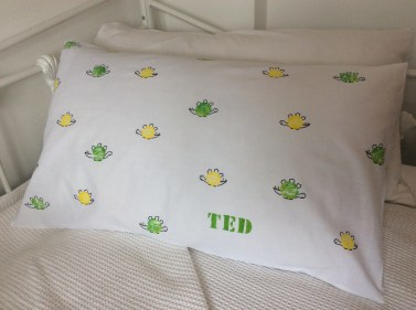 All my bedding is hand printed on white to make the designs stand out. I have many different designs and everything is made to order. Names and dates can be added for that personal touch.